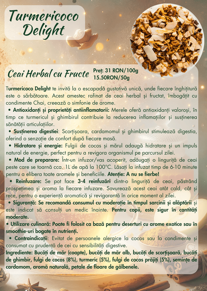 Turmericoco Delight te invită la o escapadă gustativă unică, unde fiecare înghițitură este o sărbătoare. Bucură-te de beneficiile antiinflamatorii ale turmericului și ghimbirului, completate de prospețimea fulgilor de cocos.